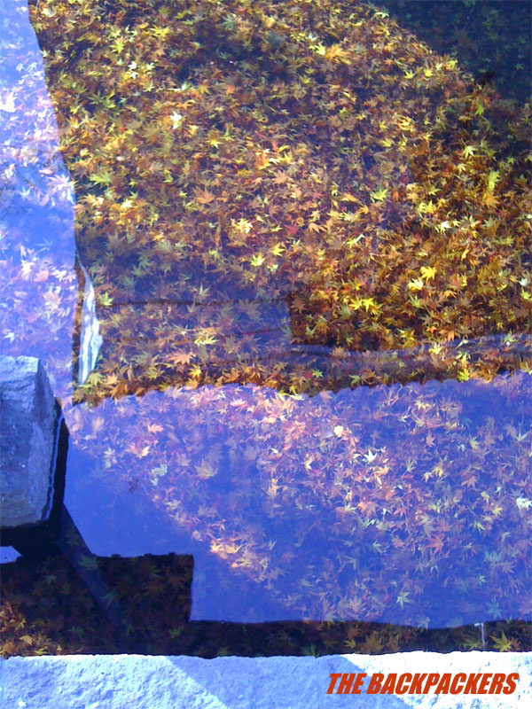 朝には落ち葉や花びらが白く縁取られている。