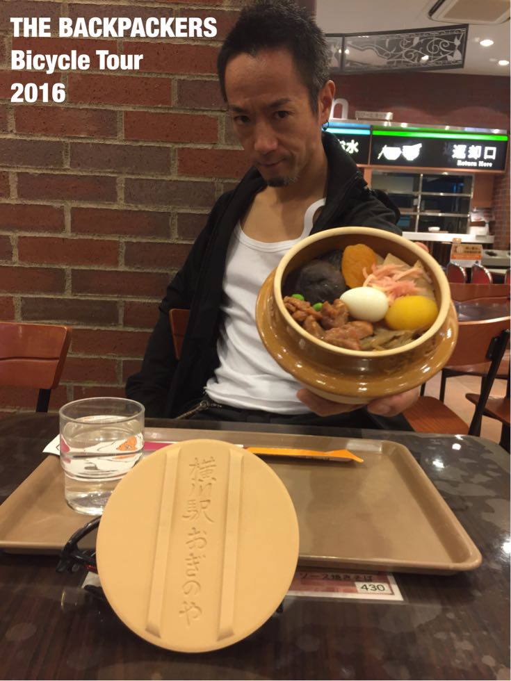 ひーこら山に入って数キロ、元祖峠の釜めし 【おぎのや】とある。
