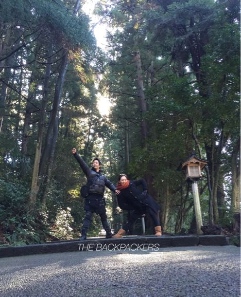 マイナスイオン天国の白山比咩神社の道中、イカすポーズ。